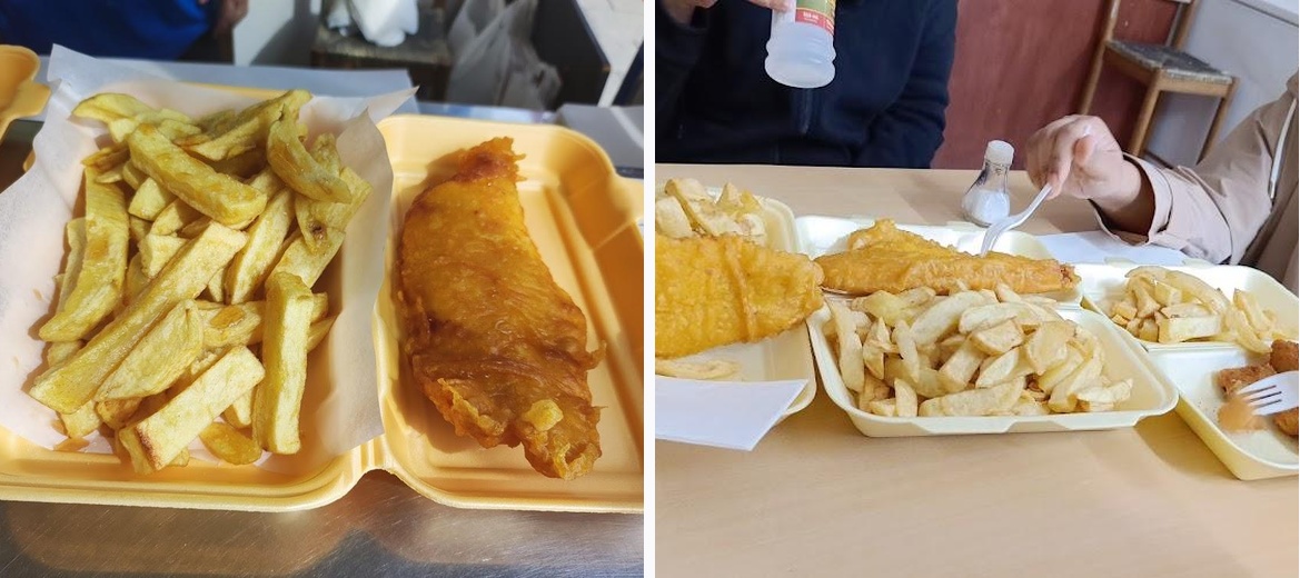 Fish made fresh to order, very crispy batter and they skin the fish so you can eat all of it! No batter wasted on the skin left behind. Chips were hot and fresh, chunky home style authentic chip shop chips. Less than 5 min walk from the seafront, worth the extremely short walk for quality fish and chips at the beach. £24.60 for medium cod and chips for 2.